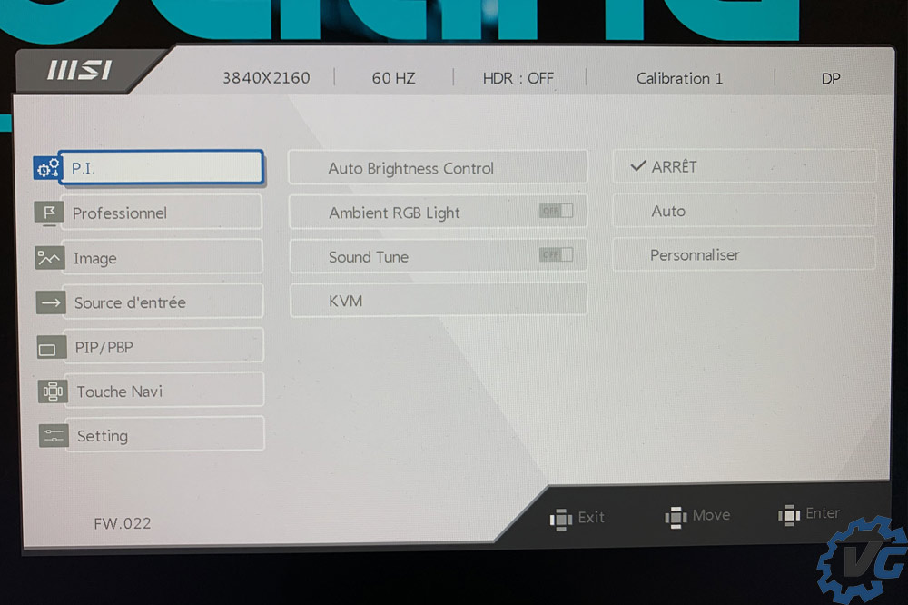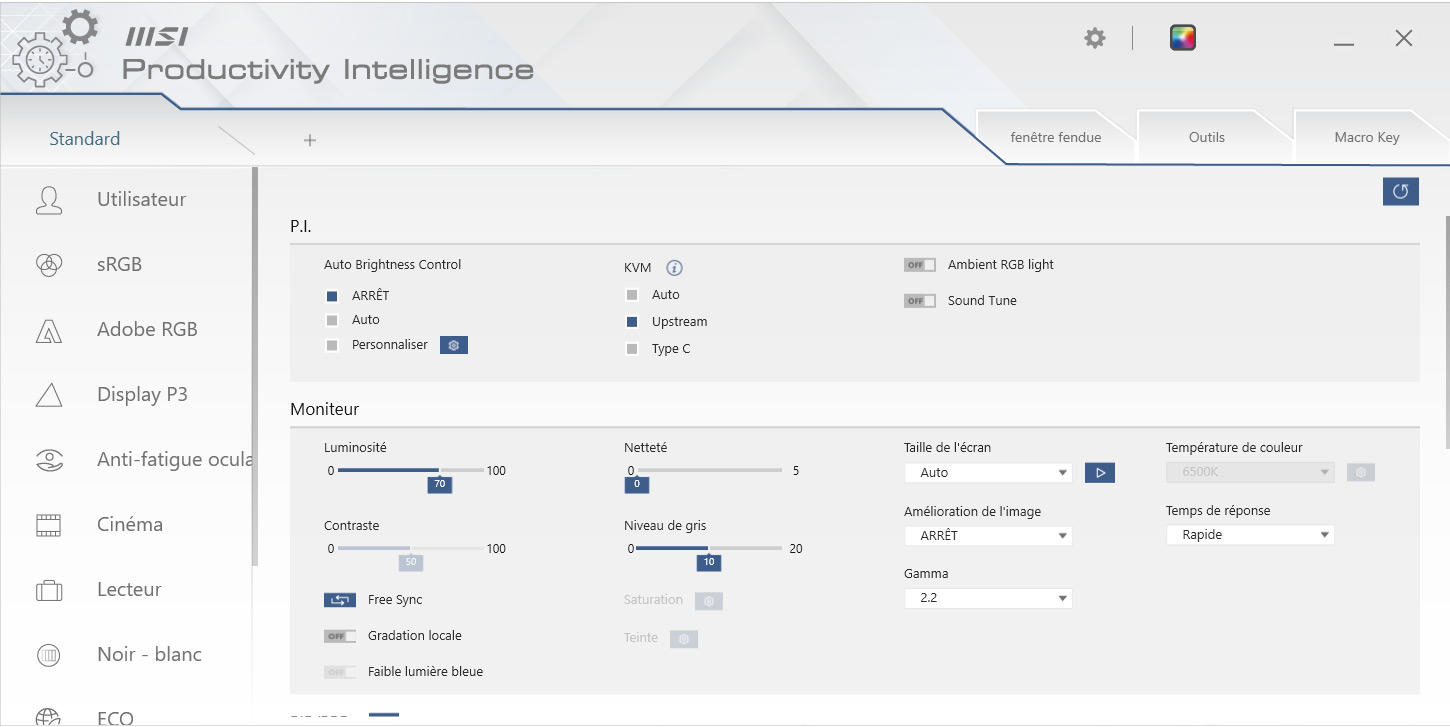 En plus d’un accès conventionnel à l’OSD, cet écran propose un logiciel accessible quand l’écran est connecté en USB. Celui-ci peut se lancer depuis l’ordinateur ou via un bouton en bas à gauche de l’écran. Ce logiciel « MSI Productivity Intelligence » permet de faire à la souris tout ce qu’il est possible de faire sur l’OSD.
