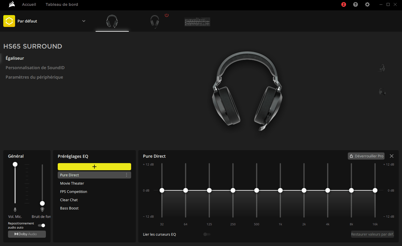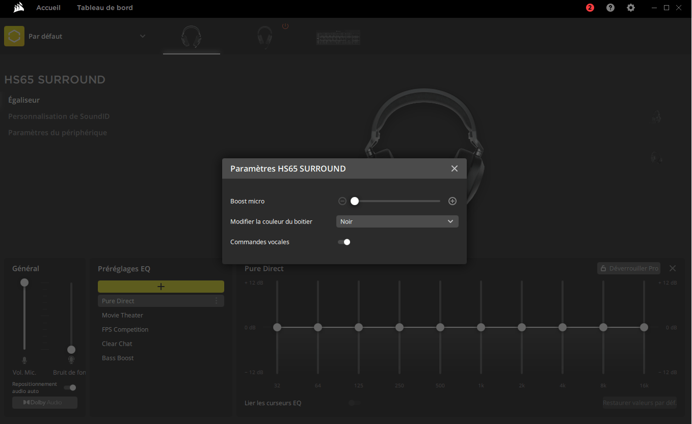 Pour utiliser le logiciel iCUE sur PC, il faudra obligatoirement se servir de l’adaptateur USB de son 7.1. Une fois connecté et le logiciel lancé, vous retrouverez l’ensemble de vos appareils Corsair, dont notre petit nouveau. Ici, vous pourrez gérer le bruit de fond de votre micro ainsi que son volume, mais aussi les égaliseurs à votre guise. Autre aspect, vous aurez quelques préréglages EQ de disponibles à savoir :