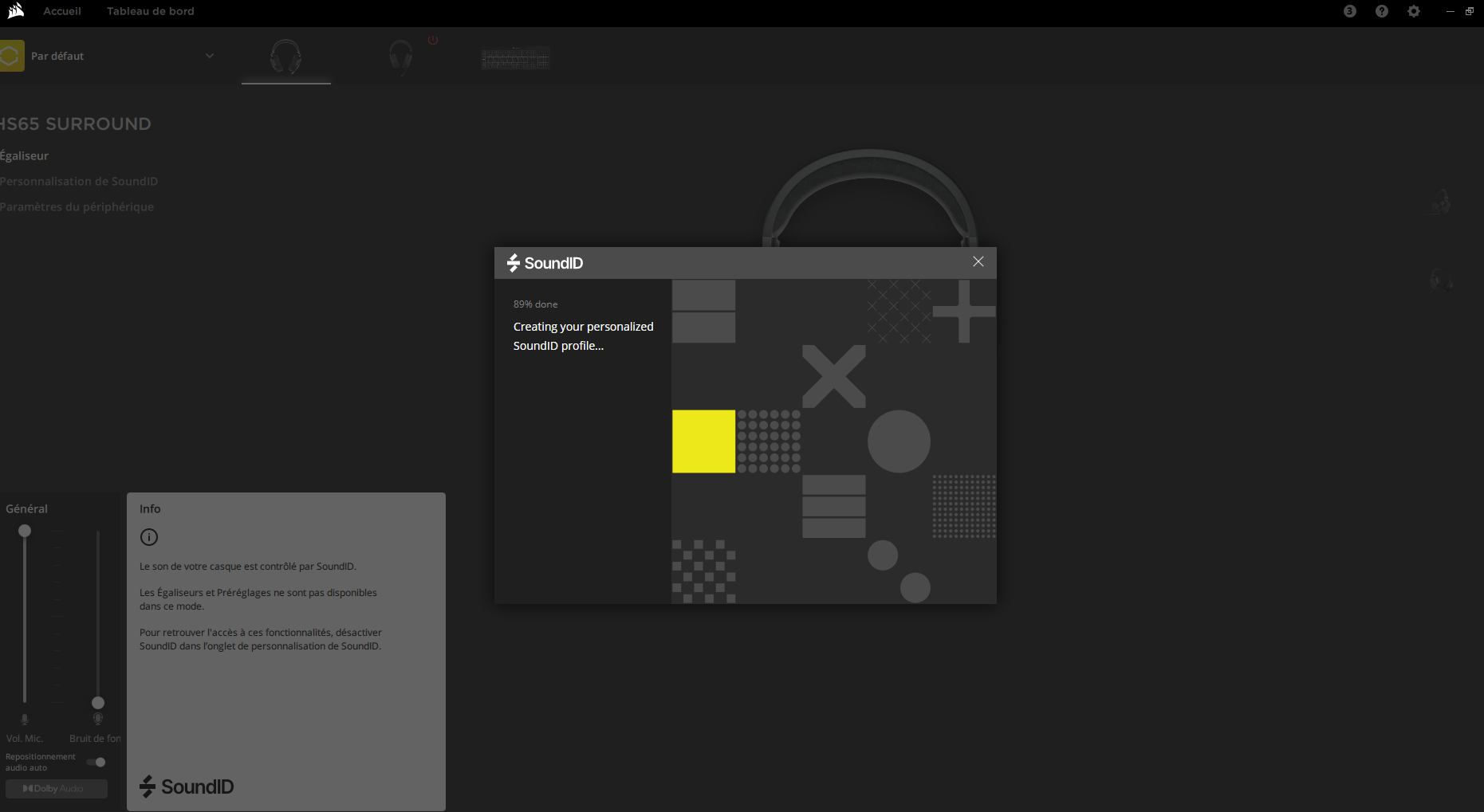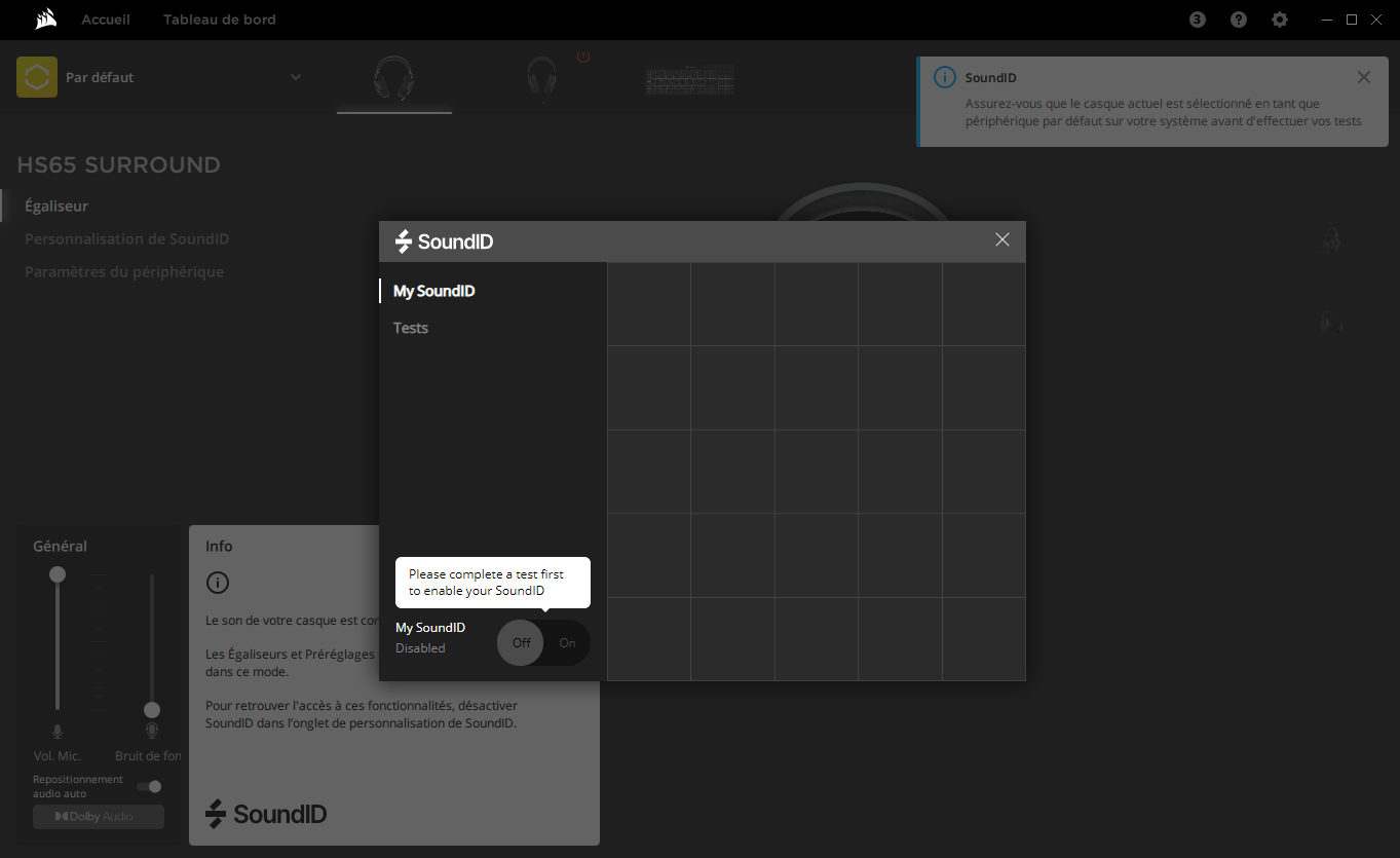 Petite nouveauté ici, la technologie SoundID, qui vous permettra de contrôler votre son de façon personnalisé, qui s’adaptera avec les paramètres de votre casque, selon vos goûts. Au départ, il vous faudra réaliser le test. Choisissez un son qui vous convient le mieux et ensuite, cliquez sur A ou B et sélectionnez le rendu audio qui vous plaît le plus. Ensuite, iCUE calculera vos préférences, pour vous proposer le son qui vous conviendra le mieux.