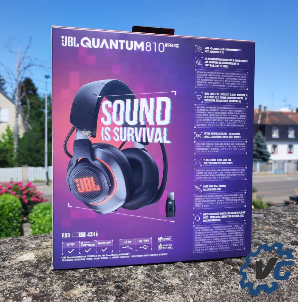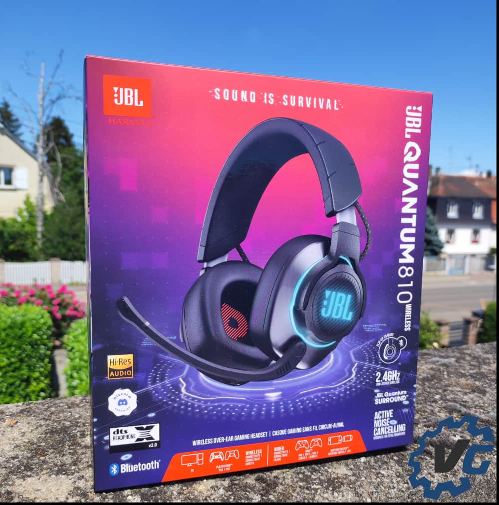 Enfin, la boîte du JBL Quantum 810 présente, sur sa boîte, certaines propriétés originales et excitantes. Si la promesse d’une connexion sans-fil sans perte et la réduction de bruit active sont des points intéressants, c’est surtout la balance audio-chat compatible avec Discord qui semble particulièrement originale.