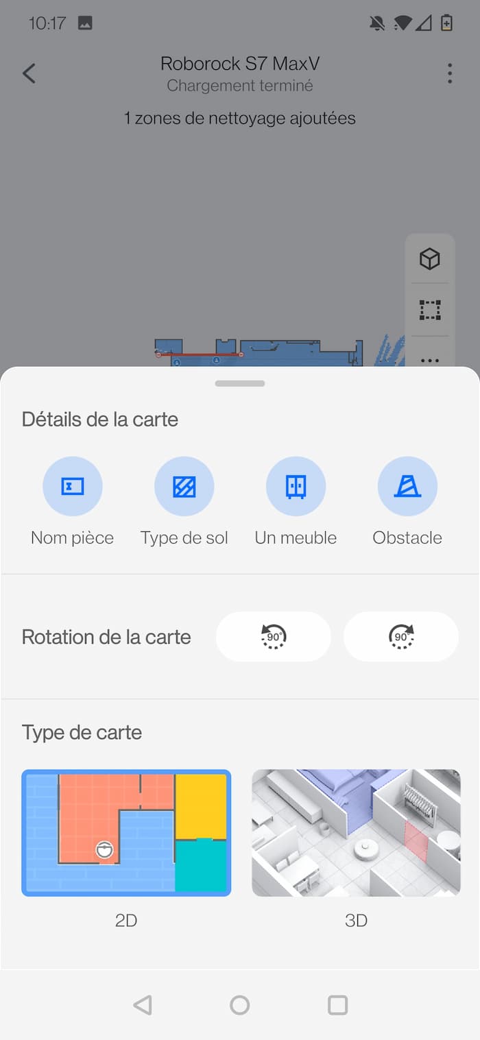 À la fin du premier exercice de cartographie sur S7 c’est avec étonnement que nous constatons ainsi un plan étonnamment précis de notre maison. Le S7 va jusqu’à différencier le tapis du bois dur de notre parquet. Il nomme même les meubles comme les canapés et le meuble de bibliothèque. C’est incroyablement impressionnant et vous pouvez même facilement corriger les petites erreurs d’interprétation d’indentification des meubles dans l’application. Comme évoqué au début de cet article, la détection de pièce signifie également que vous pouvez créer des zones de votre maison à nettoyer en priorité.