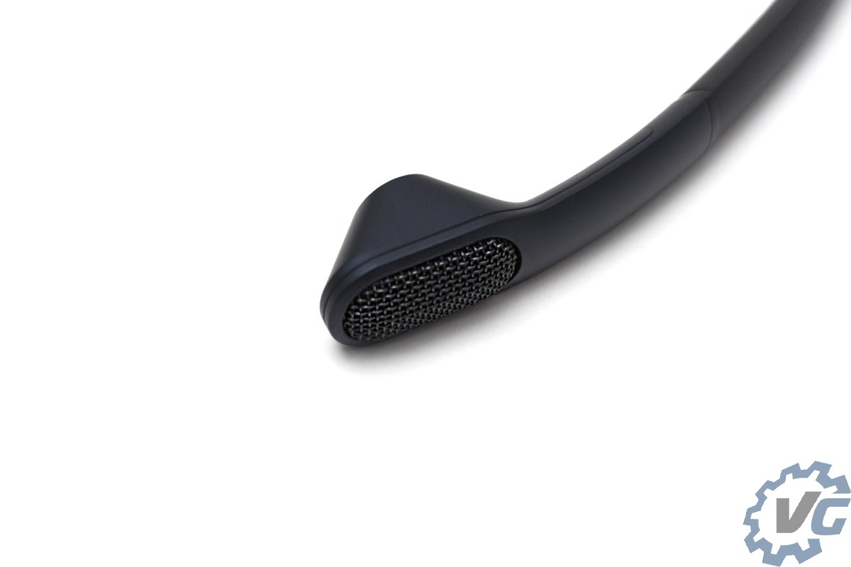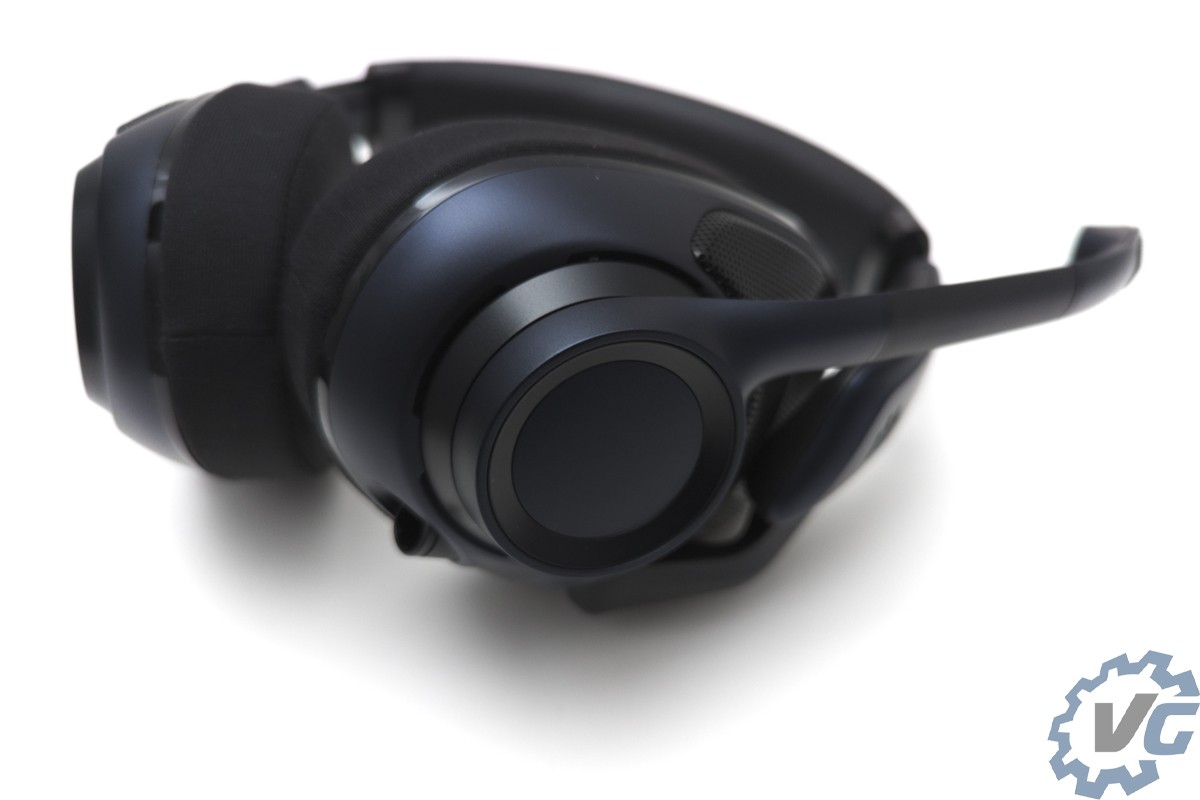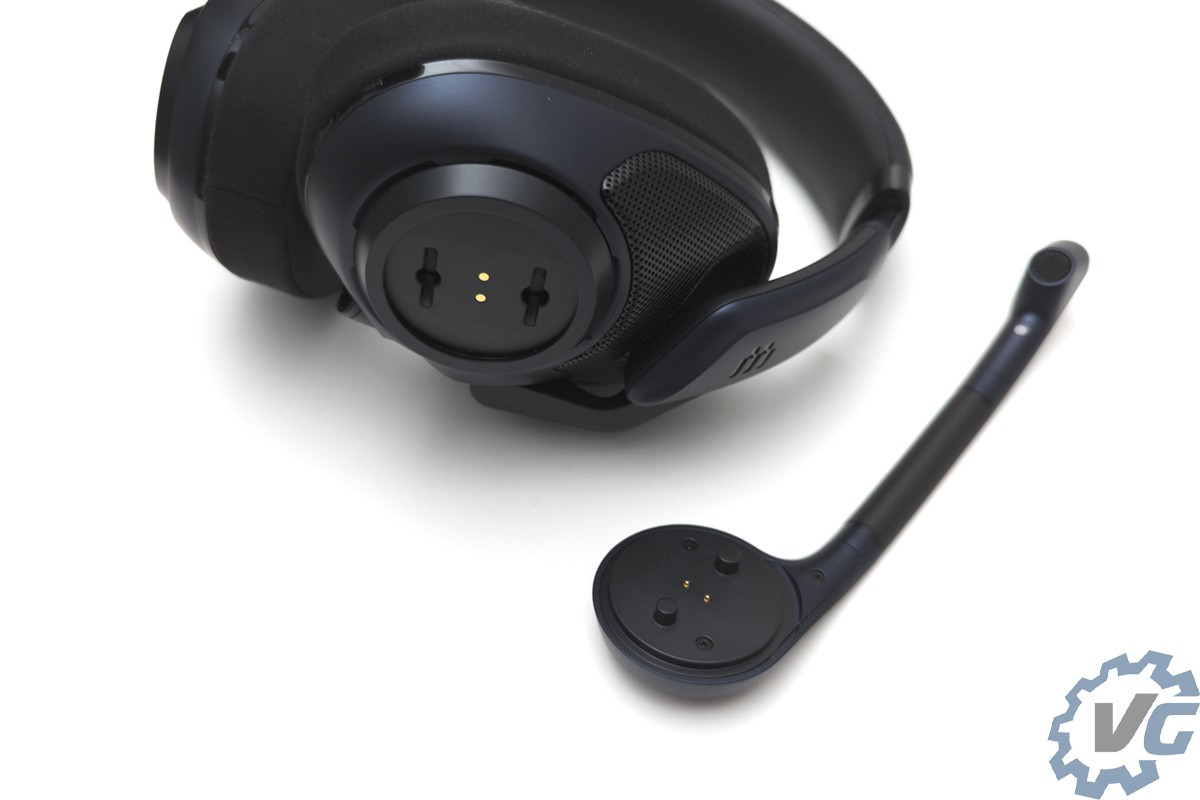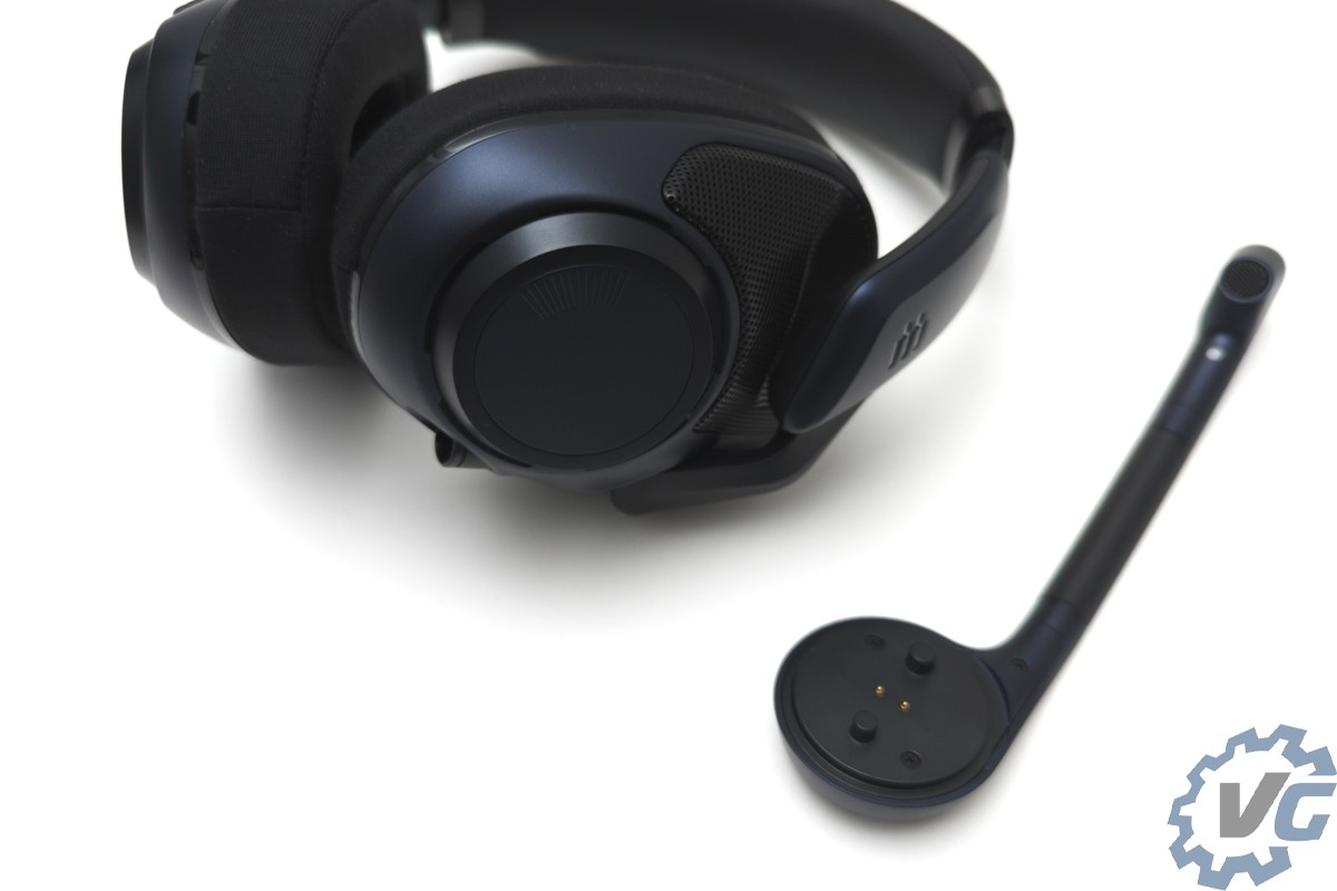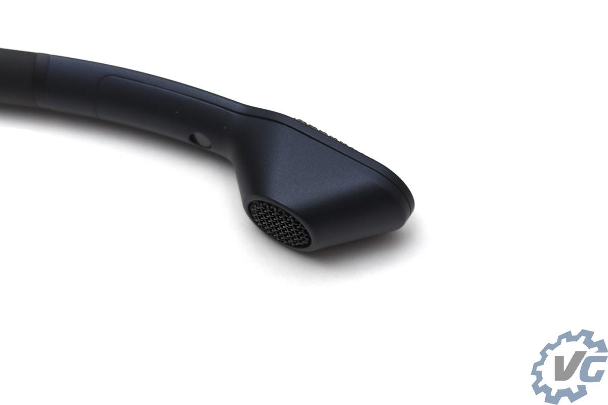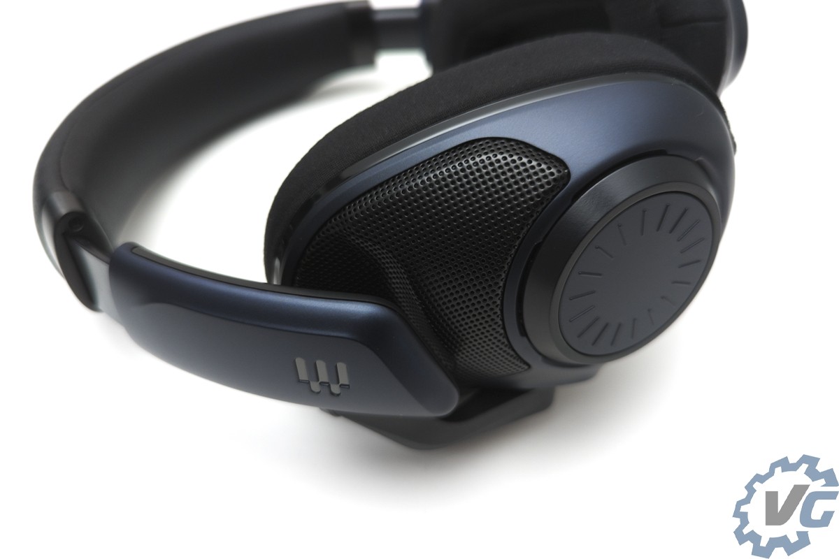 On commence le tour du casque avec les particularités de celui-ci, à savoir sa conception ouverte mais aussi le microphone détachable. Sur l’extérieur, nous pouvons voir les grilles permettant à ce casque de concourir dans la section des casques ouvert pour gamer. On retrouve à droite du casque la molette de réglage du volume et à gauche le microphone détachable.