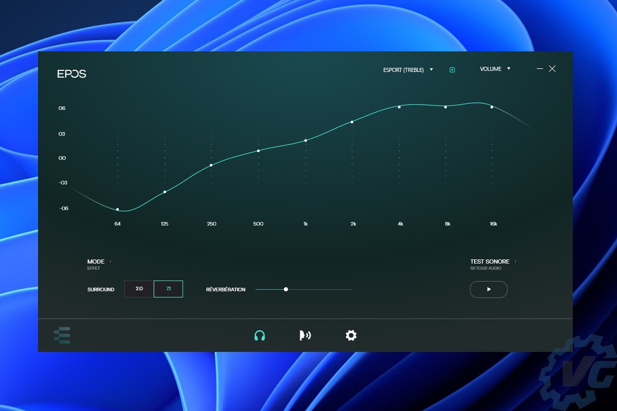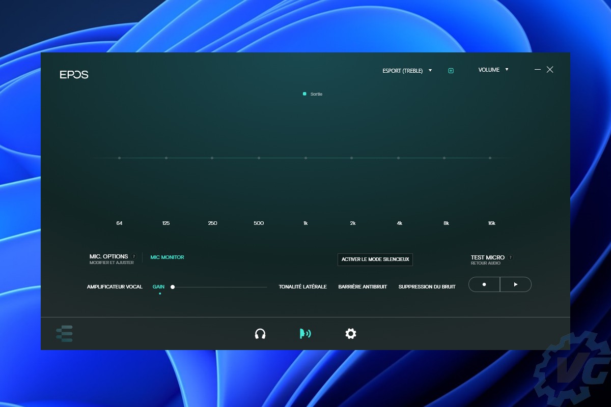 Coté logiciel, nous avons logiciel EPOS Gaming Suite, qui permet le réglage du casque et du microphone. Nous avons pour le casque la possibilité de régler l’équaliseur manuellement ou bien des choisir des profils prédéfinit en fonction de l’usage. Nous y retrouvons également le réglage du son en surround 7.1 avec le niveau de réverbération. Pour la partie microphone, les réglages sont légions, amplifications vocal, tonalité latéral, barrière antibruit ou encore suppression du bruit. C’est ce dernier mode qui s’avère être très intéressant avec ce logiciel.