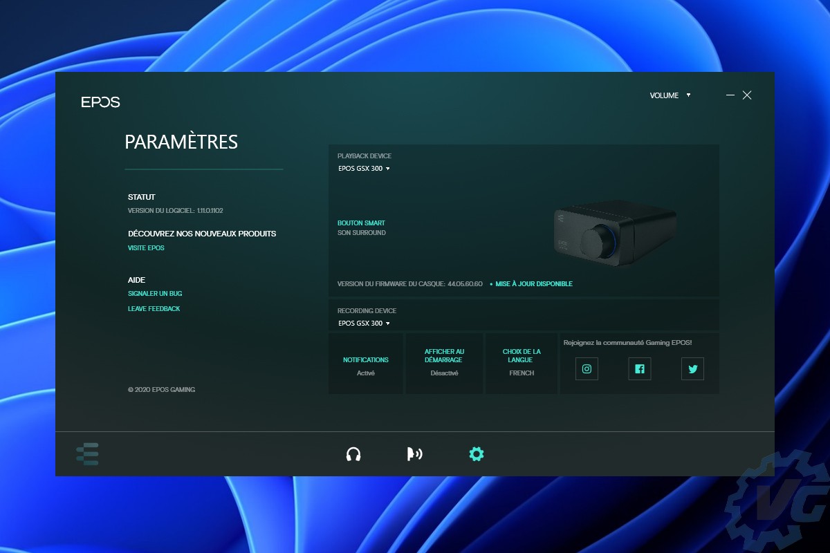 Passons maintenant au DAC EPOS GSX300 qui vient compléter parfaitement le casque grâce à son logiciel bien pensé. Il supporte les casques de 25 à 75 Ω ce qui sera parfait pour la plupart des casque gamer. Sa molette contrôle directement le son sous Windows mais impossible de le couper en la pressant.