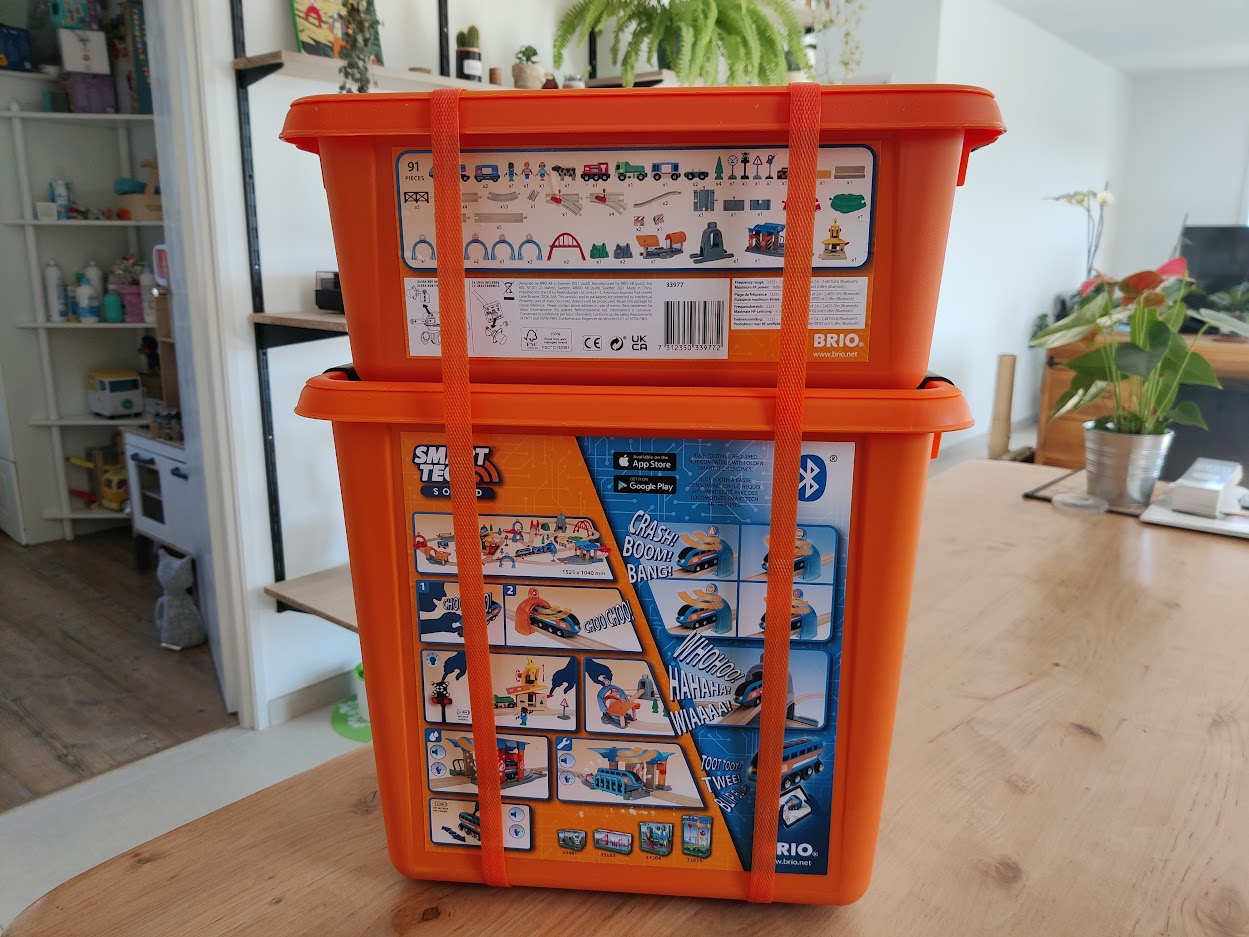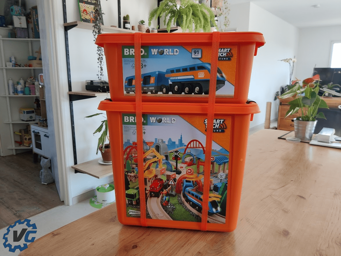 Notre circuit arrive dans un gros carton estampillé Brio, pour un poids de 7,5 kg. Une fois à l’intérieur, on retrouvera son packaging, sous forme de boite rigide orange en plastique, qui fait également office de boites de rangements. Extrêmes pratique quand votre enfant aura terminé de jouer.