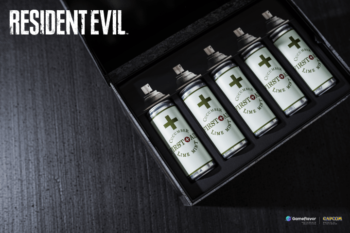 « Lors de la création d’objets à collectionner, Il est essentiel de capter l’essence de l’objet en jeu et ainsi, faire en sorte de le retranscrire dans le produit réel. » a déclaré Michael Codd, PDG de GameFlavor. « Cela signifie qu’il faut reproduire l’aspect, l’odeur ET le goût pour que tous les fans de Resident Evil découvrent un produit identique à ce qu’ils avaient imaginé, ici le Spray de premier secours de Resident Evil.»