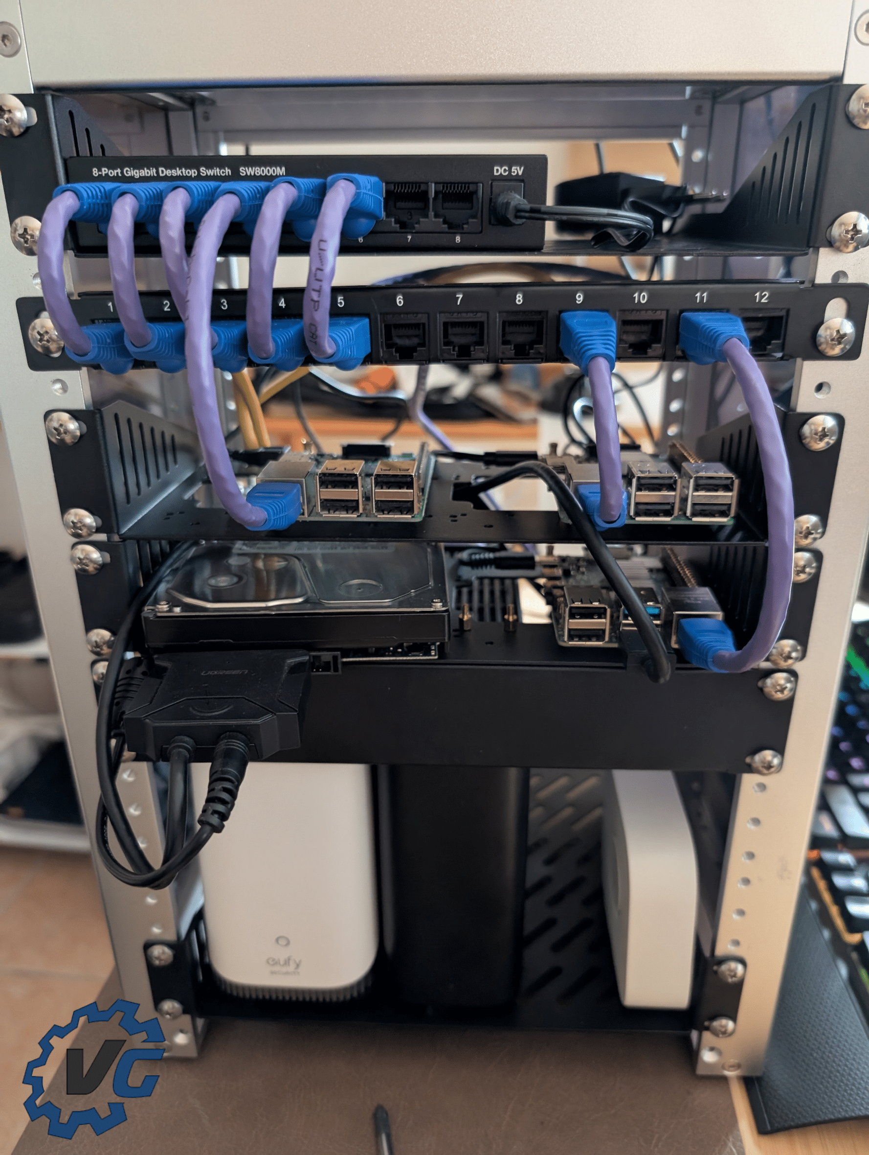 Notre nouvel arrivant a trouvé sa place aux côtés de la HomeBase 3 de eufy, de la box internet, du BeeStation de Synology, mais nous l’avons surtout placé à l’intérieur du RackMate.