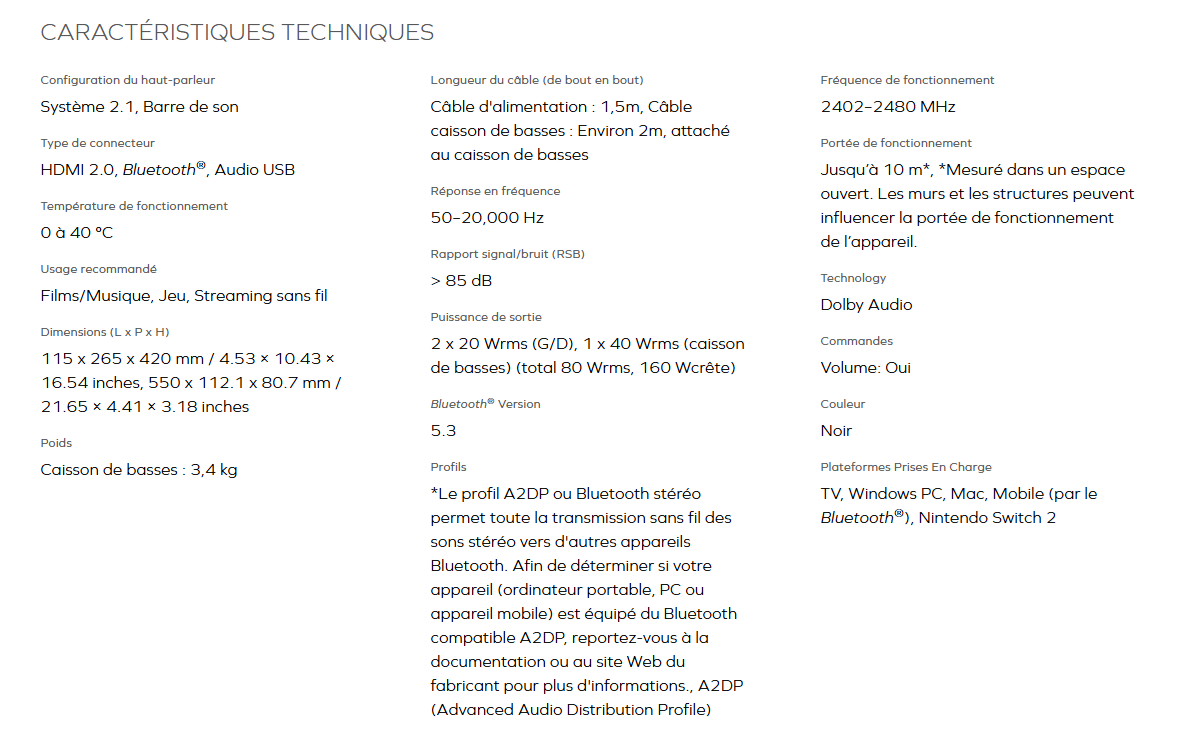 Son design compact et épuré, avec une largeur de 55 cm et un caisson de basses discret, facilite son intégration sous un téléviseur ou sur un meuble, s’adaptant sans effort à différents intérieurs. En termes d’usage, la barre offre un rendu sonore impressionnant pour sa taille et son prix, surpassant largement les haut-parleurs intégrés des téléviseurs, même si elle ne propose pas de technologies comme le Dolby Atmos ou les assistants vocaux.