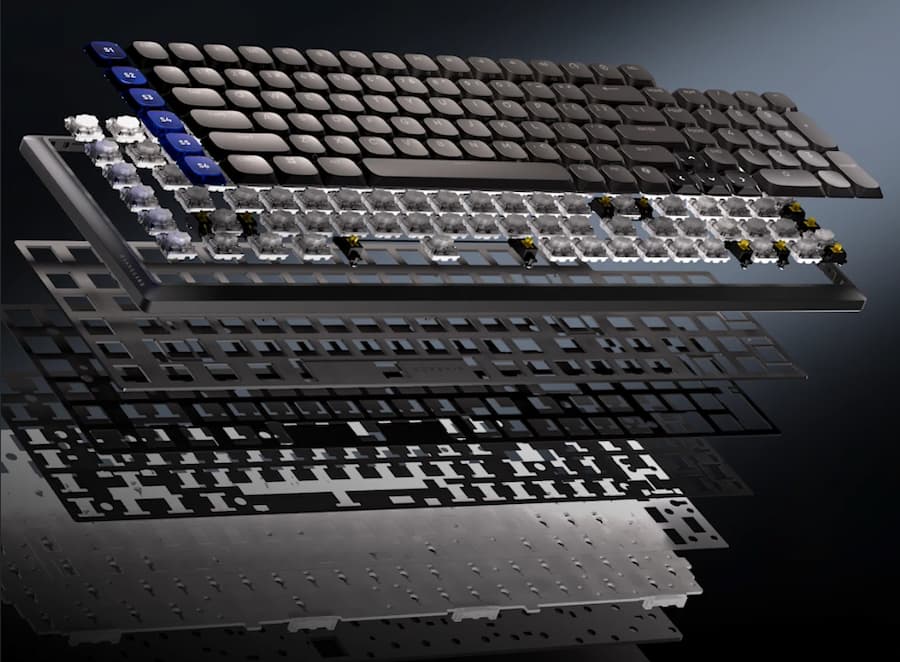 De prime abord, le design de ce nouveau périphérique haut de gamme ne laisse absolument personne indifférent. Ce modèle adopte un format spécifique à 99%, qui compacte l’ensemble tout en conservant scrupuleusement le sacro-saint pavé numérique. Le châssis en aluminium sculpté est d’une très grande finesse et respire immédiatement la solidité. Ce lourd cadre métallique ajoute une touche résolument premium au bureau de n’importe quel joueur.